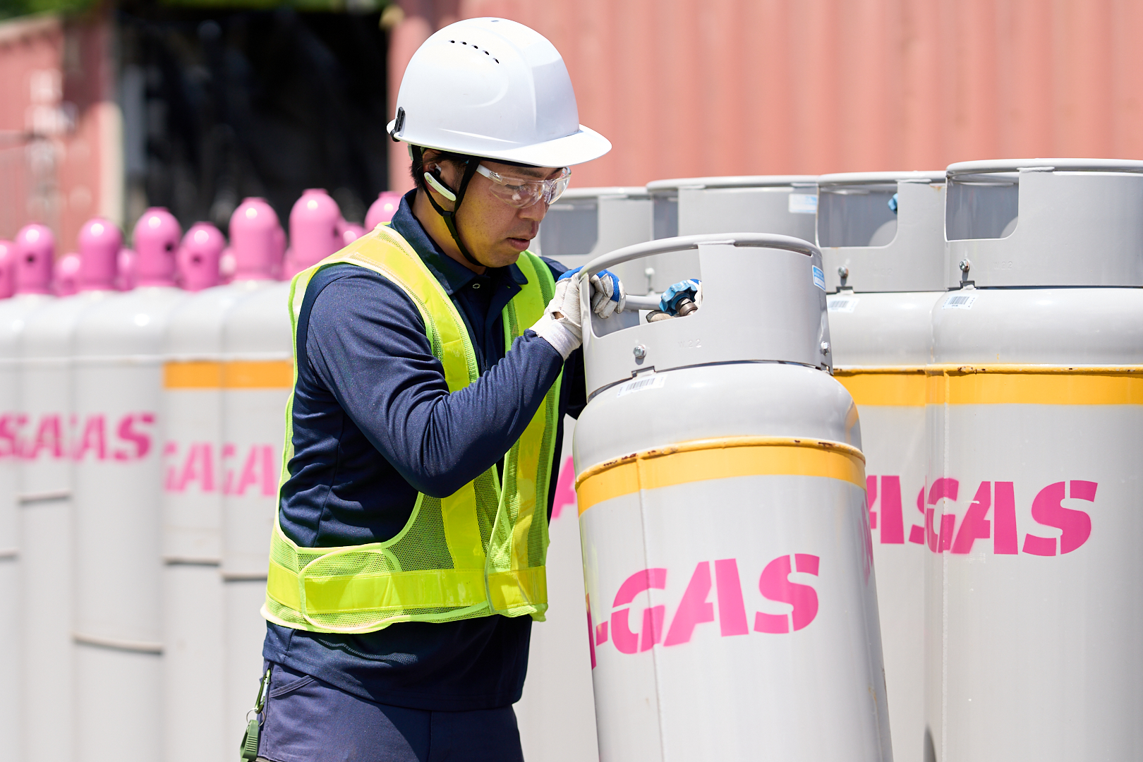 engineer with blue gloves handling and cleaning A-Gas branded gas cylinder