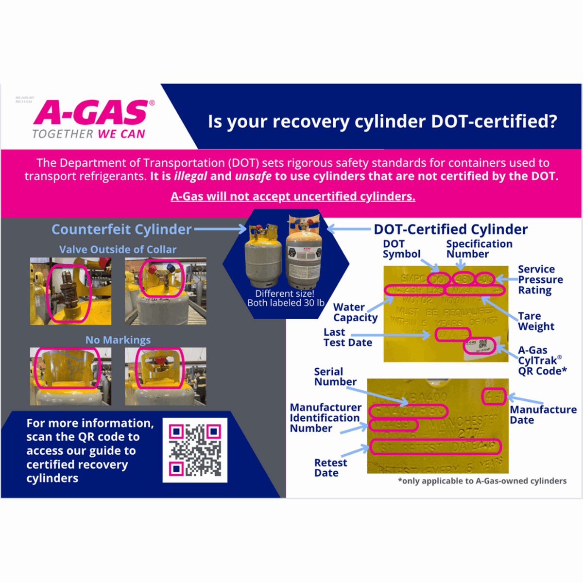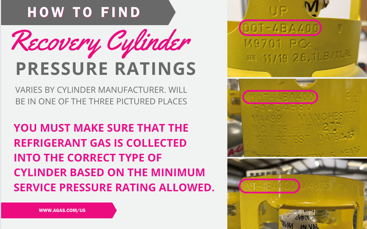 To comply with these requirements and for the safety of our technicians (and yours), A-Gas will not accept refrigerant in overfilled cylinders or cylinders that do not meet the required service pressure of the refrigerant recovered.